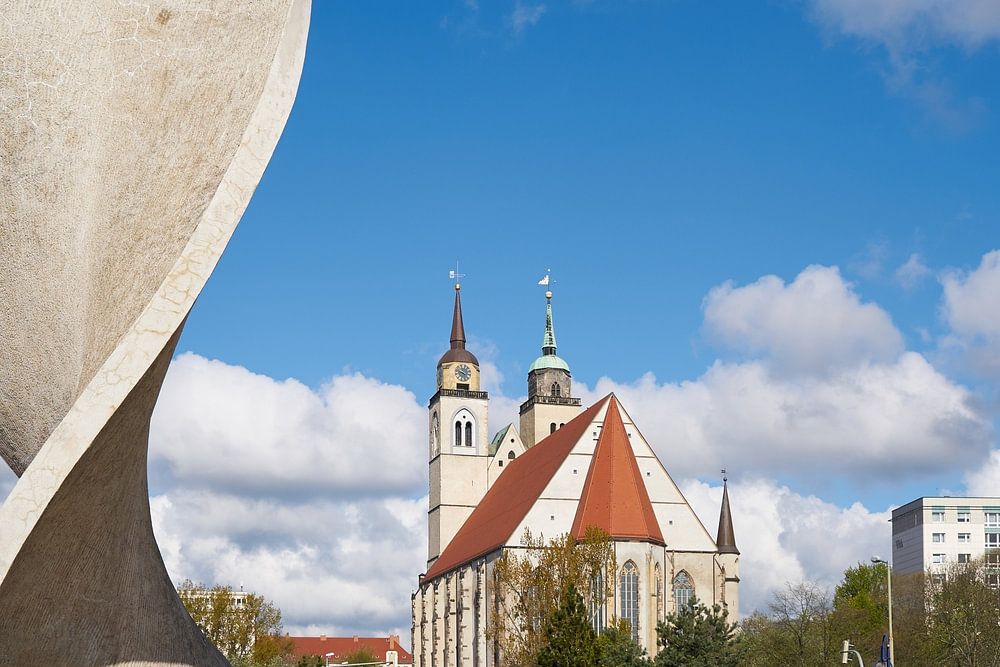 Fahnenmonument am Ufer der Elbe bei Magdeburg. Im Hintergrund die Johanniskirche.