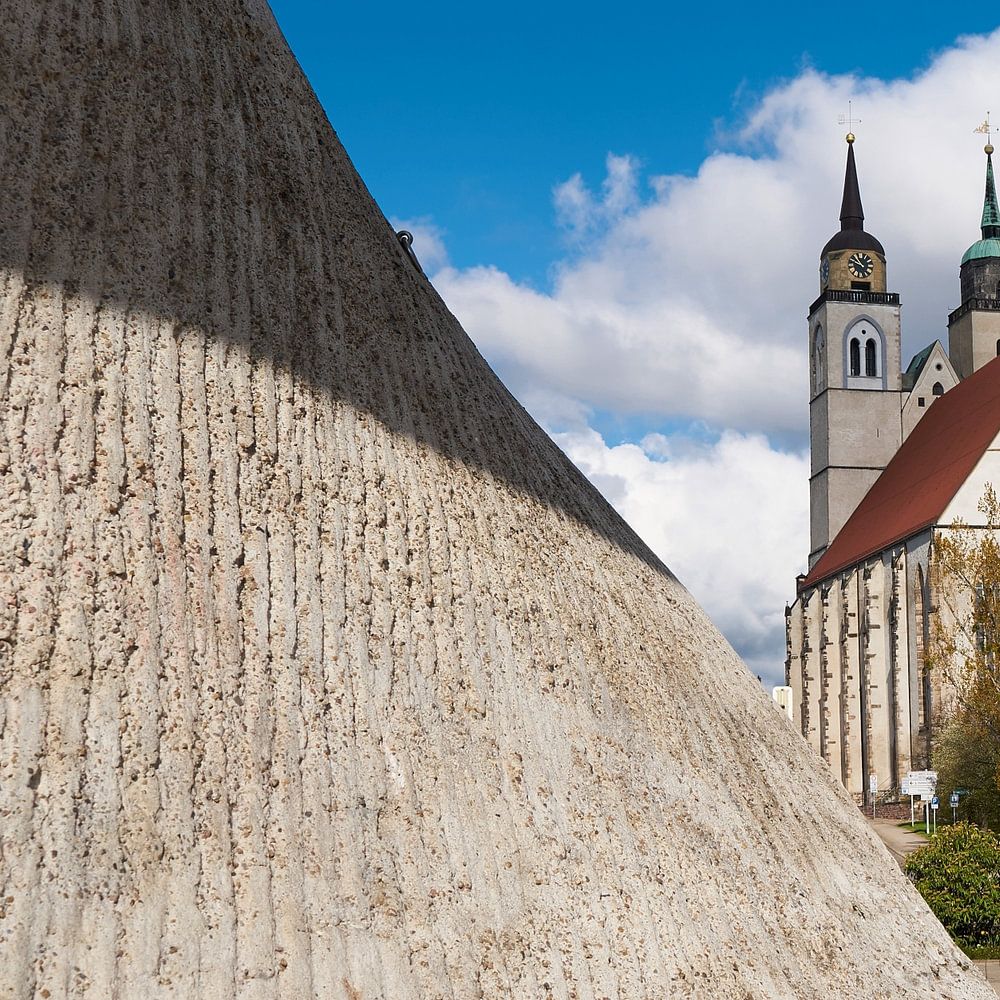 Detail des Fahnenmonuments am Ufer der Elbe bei Magdeburg. Im Hintergrund die Johanniskirche.