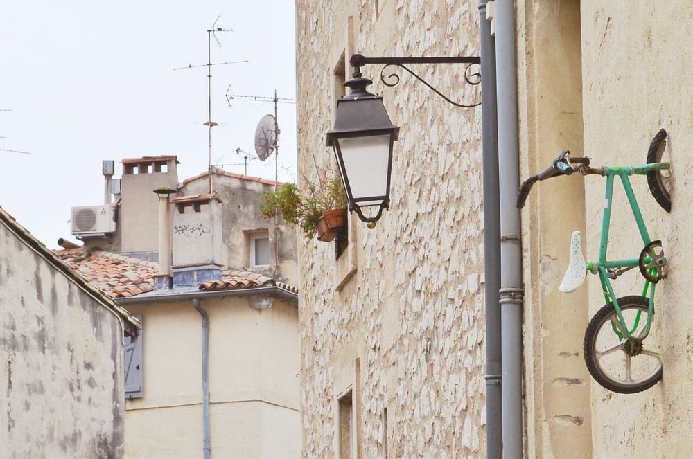 Ein Kinderfahrrad, das an der Wand eines alten Gebäudes in der südfranzösischen Stadt Montpellier verankert ist.