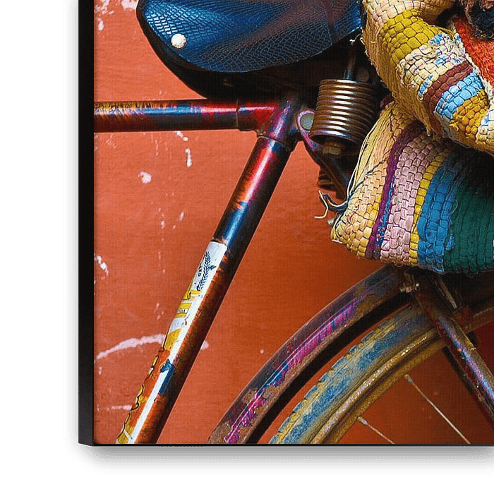 Sehr buntes Foto eines alten Fahrrades mit bunter Wolldecke gegen rote Wand. Agra Fort, Indien.