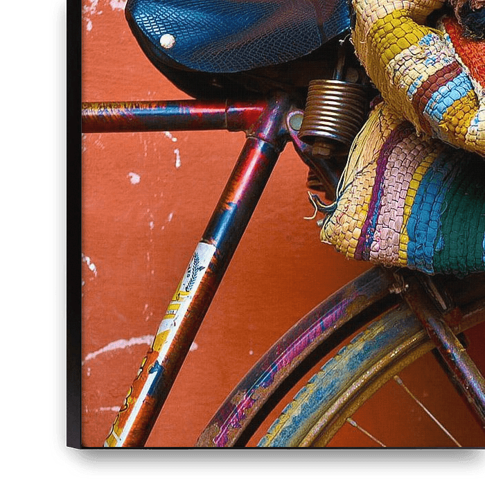 Sehr buntes Foto eines alten Fahrrades mit bunter Wolldecke gegen rote Wand. Agra Fort, Indien.