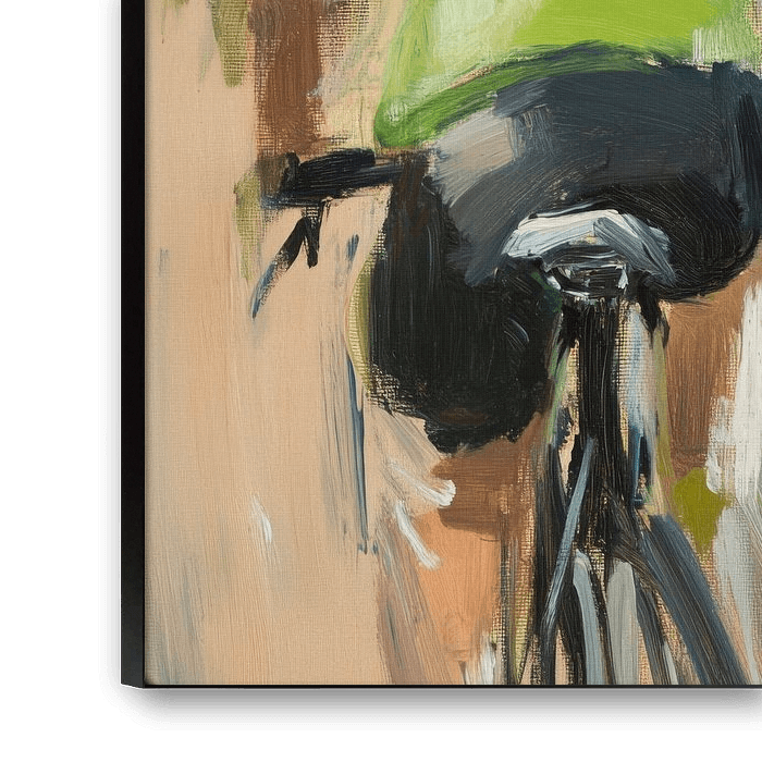 Ein dynamischer Moment, eingefangen in lebendigen Farben! Der Radfahrer, in leuchtendem Grün gekleidet, scheint mit jeder Pinselstrich geschwindigkeit zu gewinnen. Die verschwommenen Hintergründe und sanften Erdtöne intensivieren das Gefühl von Freiheit und Bewegung, während die Natur um ihn herum sanft im Wind weht. Ein fantastisches Spiel von Energie und Lebensfreude!