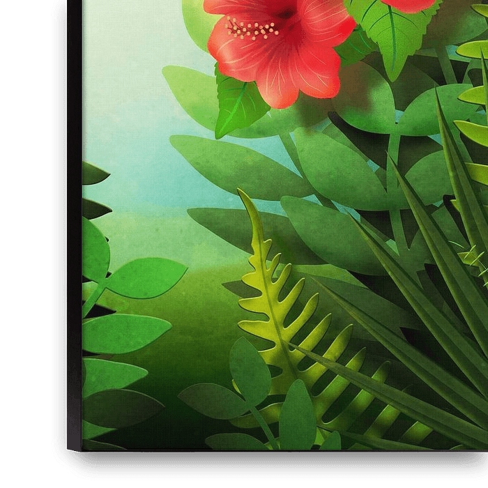 Bestelle dieses Blumen-Wandbild Fantasie Dschungel mit Hibiskus von Britta Glodde als Reproduktion auf Leinwand, Alu-Dibond, als Poster, Fototapete oder Acrylglasbild.
