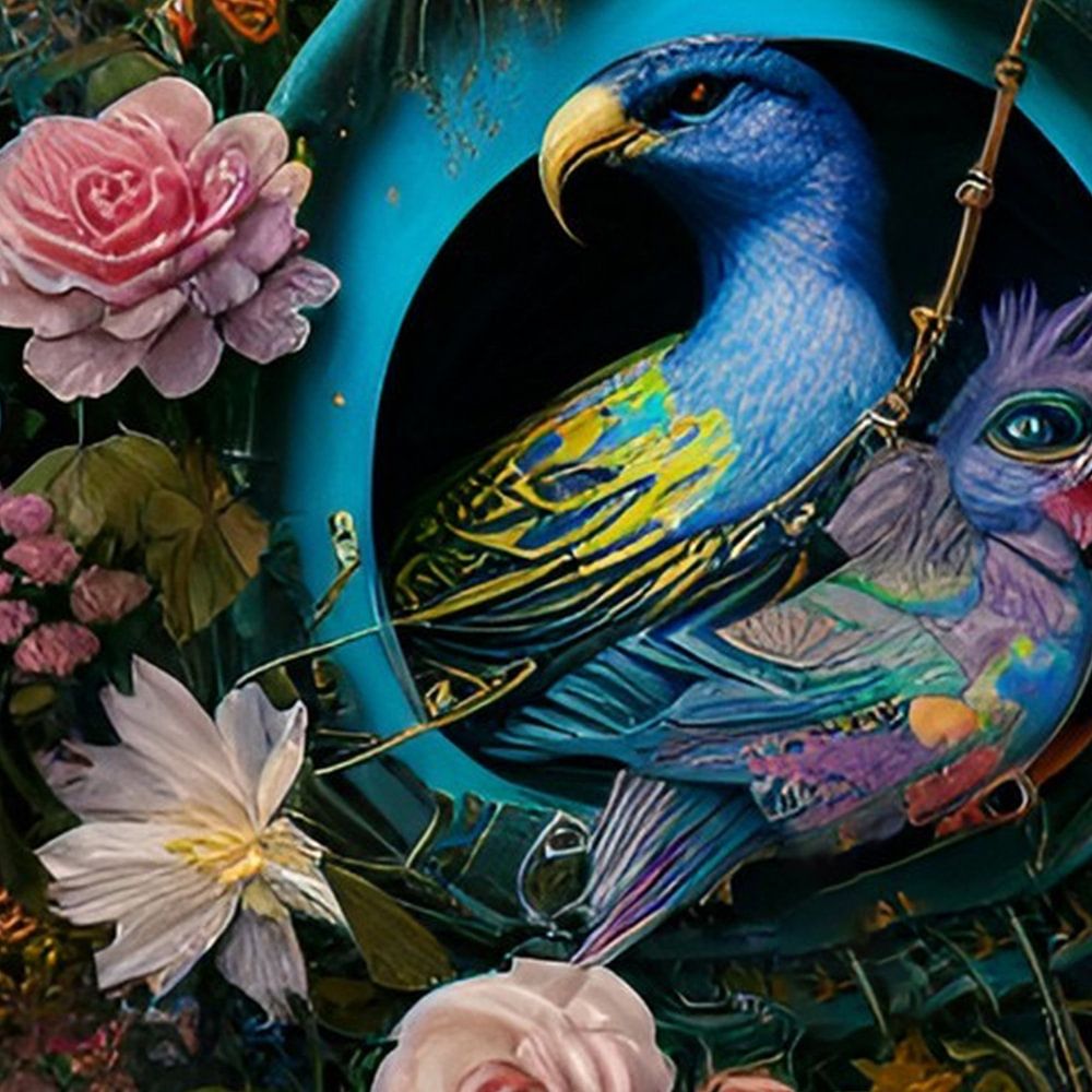 Ein üppiger Blumenstrauß, der ein Vogelhaus mit einem blauen Vogel umgibt. Dieses digitale Bild wurde im Stil eines alten Blumenstilllebens erstellt. Wenn Sie genau hinsehen, können Sie zwei Vögel darin versteckt sehen.