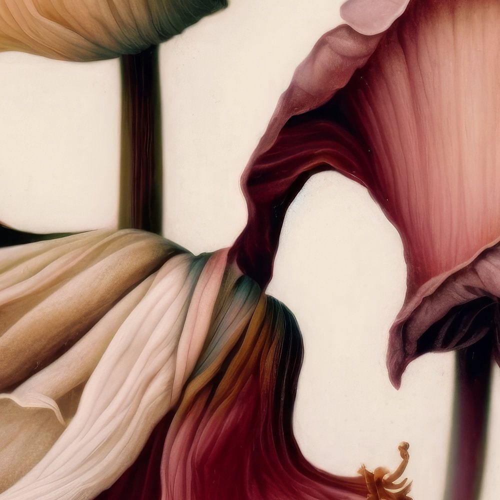 Fantasieblumen in Pastellfarben. Diese Blumen sind sorgfältig komponiert und basieren auf echten Blumen, aber sie existieren nicht wirklich, nur in meinem Computer. Ich habe sie so komponiert, dass ein einzigartiges Werk in subtilen Farbschattierungen entsteht.