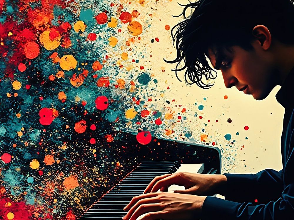 Auf diesem Bild sehen wir einen phantasievollen Pianisten, der inmitten von Blumen spielt, die um ihn herum tanzen. Die feurigen Farben und das intensive Licht verleihen der Szene eine dramatische, fast mythische Atmosphäre, als ob die Musik die Flammen anfachen würde. Der Pianist wirkt furchtlos, sein Gesicht ist in Konzentration gehüllt, während das Feuer Kraft und Leidenschaft symbolisiert, sein Spiel verwandelt und eine magische, eindringliche Atmosphäre schafft.