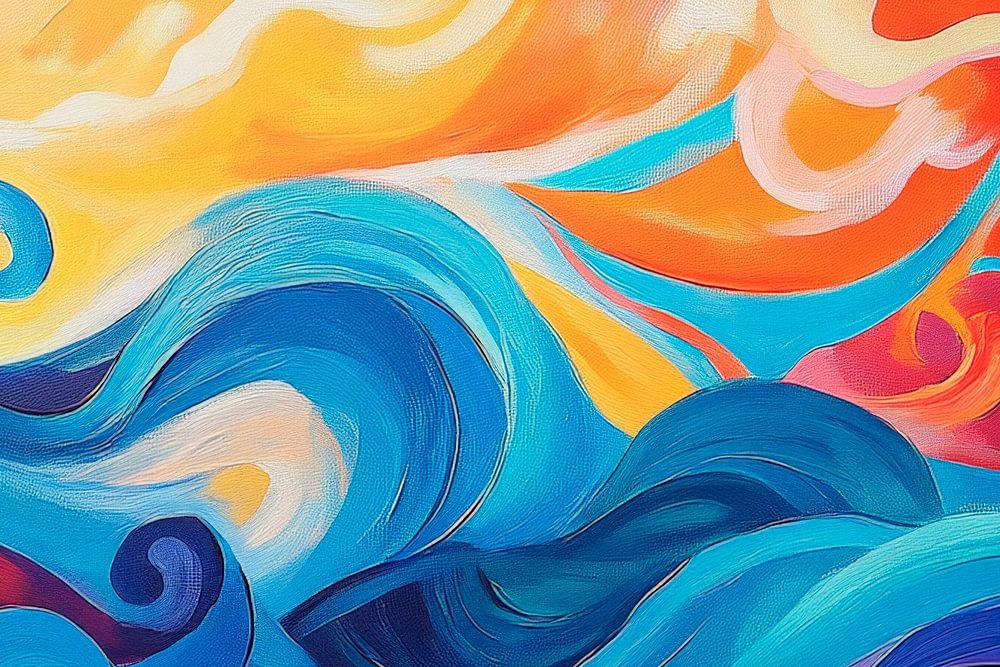 Lebendige Wellen in leuchtenden Blau- und Rottönen tanzen harmonisch unter einem strahlenden Sonnenaufgang. Diese dynamische Komposition strahlt Energie und Ruhe zugleich aus und weckt Sehnsucht nach dem Meer. Perfekt geeignet für das Wohnzimmer, schafft sie eine einladende und inspirierende Atmosphäre, die Gespräche anregt und den Raum belebt.