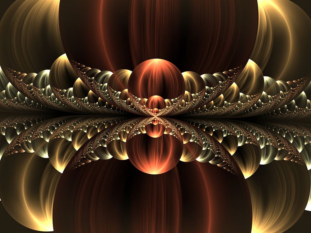Moderne Kunst, digital und abstrakt. Fraktale sind mathematische Wunderwerke, sie regen die Fantasie an, sie sind magisch, mystisch, können eine spirituelle Wirkung haben und sind als moderne Grafik der Blickfang an jeder Wand, Bilder, die auffallen. Die bestimmenden Farben in diesem futuristischen und surrealen Kunstbild sind bronze und gold.