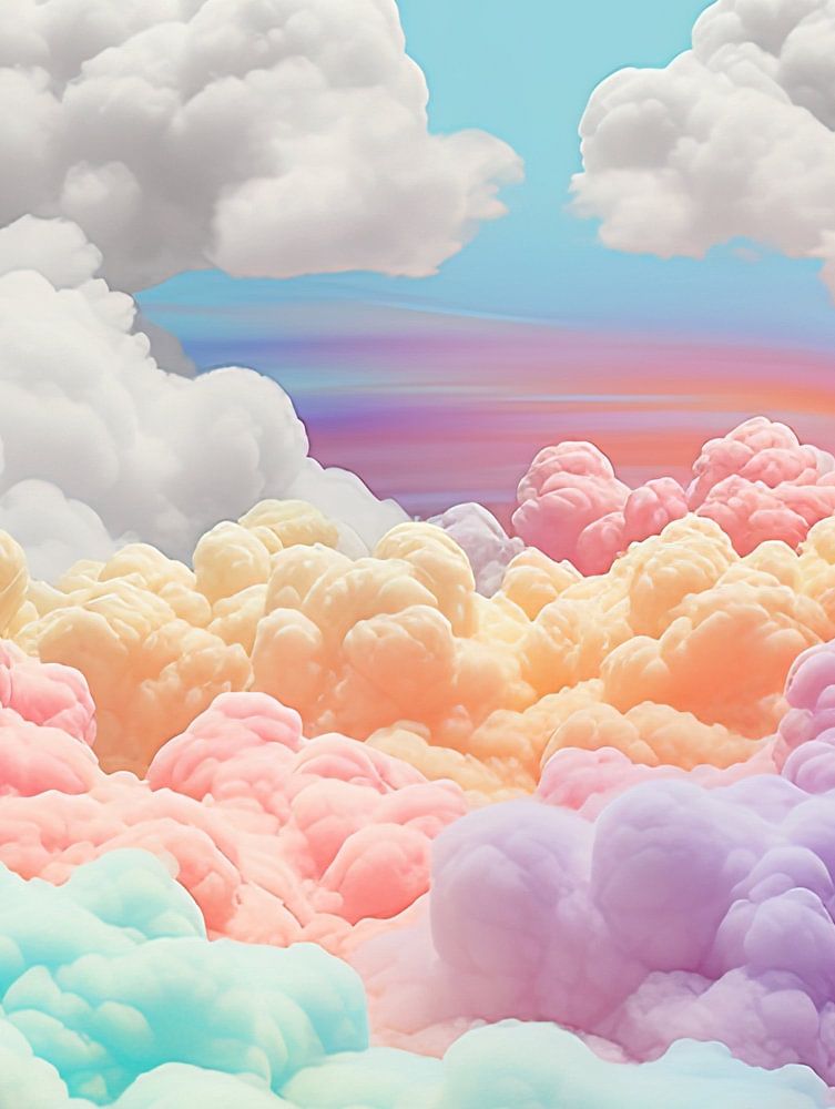 Die Wolken sind nicht die üblichen weißen Formationen, an die wir gewöhnt sind, sondern eine leuchtende Palette von Farben. Der Vordergrund ist mit Schichten aus orangefarbenen, rosa, lila und blauen Wolken gefüllt, die eine weiche, fast baumwollartige Textur zu haben scheinen. Über diesen farbenfrohen Wolkengebilden erscheint ein leuchtender Regenbogen, der sich sanft in den Himmel krümmt. Der Hintergrund bleibt ein ruhiger blauer Himmel, der einen schönen Kontrast bietet und die Aufmerksamkeit auf die bunten Elemente lenkt.
