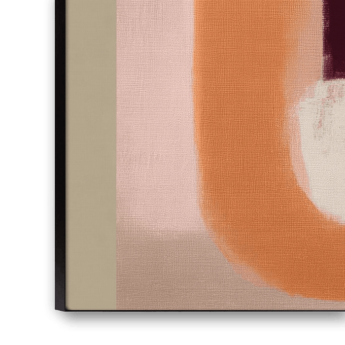 Ein modernes abstraktes Kunstwerk voller sanfter Bewegung und Farbkontraste. Warme Pfirsichtöne und tiefe burgunder- und fuchsiafarbene Töne fließen mühelos ineinander, während runde, geschwungene Formen ein Gefühl von Ruhe und Ausgeglichenheit vermitteln. Die Komposition ist sowohl verspielt als auch elegant und macht dieses Stück zu einem raffinierten Blickfang in jedem Raum. Perfekt für Innenräume, die Wärme, Charakter und einen Hauch von moderner Lebendigkeit suchen.
