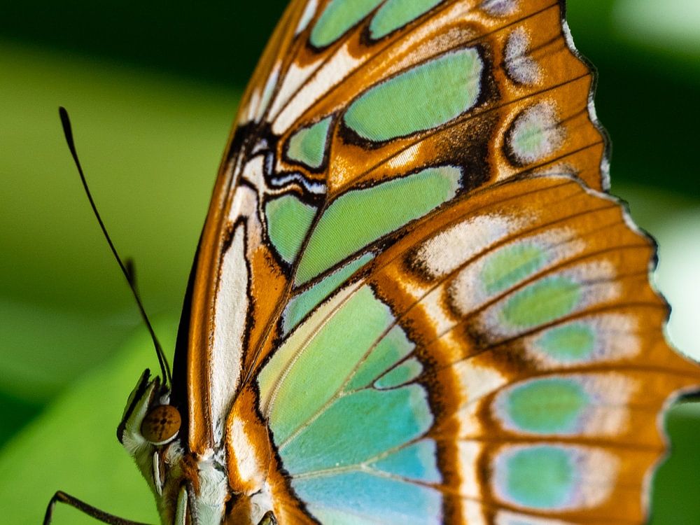 Wunderschön gefärbter Schmetterling, der auf einem Blatt posiert. Dank der schönen Farben seiner Flügel sticht dieser wunderbare Schmetterling sofort ins Auge! Dieses Foto bringt Ruhe, Fröhlichkeit und eine gute Atmosphäre in den Raum.