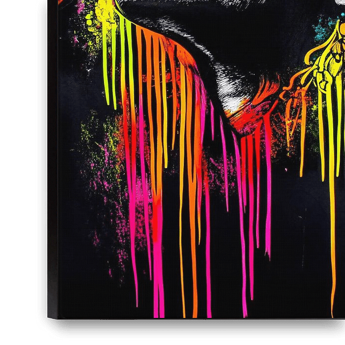 In diesem eindrucksvollen Werk verbindet sich die Energie intensiver Farben mit einer tiefen inneren Stille. Der weibliche Kopf ist im Profil abgebildet, die Augen geschlossen, als ob die Figur in einem Moment der vollkommenen Ruhe verweilt. Ihr Haar und Kopftuch explodieren in kräftigen Neonfarben, die an die Vielfalt und Lebendigkeit…