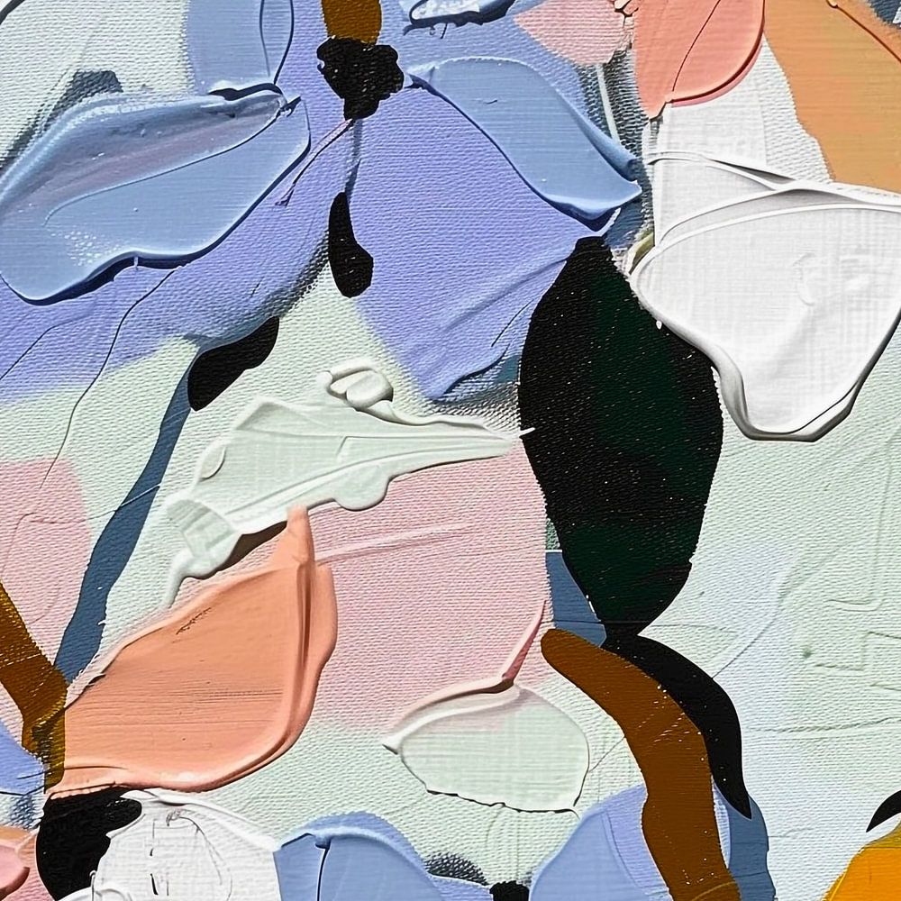Verspieltes abstraktes Gemälde, bei dem florale Formen durch dicke Farbschichten und reiche Texturen zum Leben erweckt werden. Die Komposition besteht aus einer Vielzahl von Farben, darunter Pastellrosa, Blau, Lila, Weiß, Schwarz, Orange und Grüntöne. Diese Farben werden mit dicken Pinselstrichen und in lockeren, fließenden Formen aufgetragen, wodurch die Illusion von sich überlappenden Blütenblättern und Blättern entsteht.