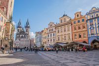 Prag, Hauptstadt der Tschechischen Republik und die goldene Stadt Europas. Auf dem Foto der Altstadtplatz mit bunten Gebäuden und die Týnkerk