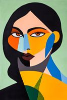 Ein faszinierendes Zusammenspiel von Farben und Formen entfaltet sich, während kräftige Blautöne und warme Gelbtöne harmonisch miteinander verschmelzen. Die intensiv blickenden Augen ziehen den Betrachter in ihren Bann, während geometrische Elemente ein Gefühl von Modernität und Selbstbewusstsein ausstrahlen. Eine kreative Verschmelzung…
