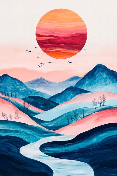Sanfte Hügel in harmonischen Blau- und Rosa-Tönen, unterstrichen von einem strahlenden Sonnenuntergang, der die Szenerie in warmes Licht taucht. Die zarten Kurven des Flusses laden zur Entspannung ein. Dieses Kunstwerk verleiht deinem Wohnzimmer eine beruhigende Atmosphäre und schafft einen perfekten Rückzugsort zum Träumen und…