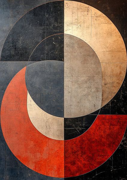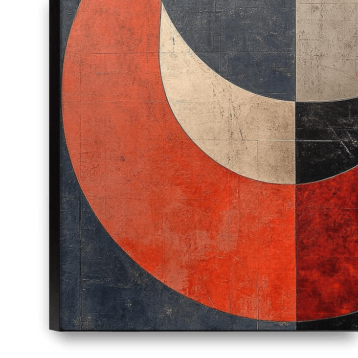 Farbenfrohe Segmente – Dieses abstrakte Gemälde besteht aus vier sich überlappenden Kreissegmenten in den Farben Dunkelblau, Rostorange, Hellbraun und Gebrochenes Weiß, wodurch eine ruhige, aber kraftvolle visuelle Harmonie entsteht.