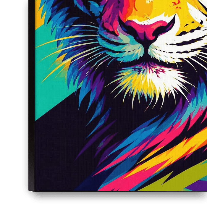 Bestelle dieses abstrakte Wandbild Farbenfrohe Tiger-Pop-Art – Auffällige Neon-Tiger-Wandkunst von Dodik Hariyono als Reproduktion auf Leinwand, Alu-Dibond, als Poster, Fototapete oder Acrylglasbild.