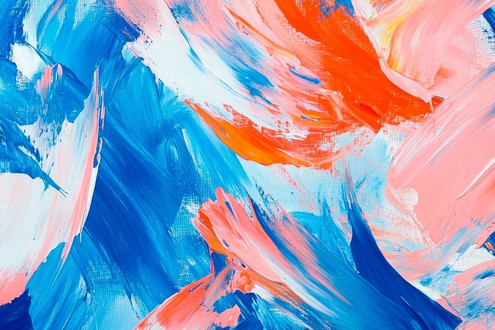Lebhafte Pinselstriche in Blau, Koralle und Weiß tanzen über die Leinwand und erzeugen eine dynamische, energetische Atmosphäre. Diese harmonischen Farbspiele verleihen einem Raum eine frische Note. Ideal für das Wohnzimmer, wo sie inspirieren und beleben können, während sie gleichzeitig eine einladende Stimmung erzeugen.