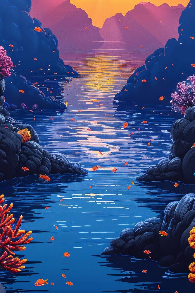 Tauchen Sie ein in die bezaubernde Schönheit eines Korallenriffs bei Sonnenuntergang. Lassen Sie sich von den leuchtenden Farben der Korallen und Fische in eine Welt der Gelassenheit und des Staunens entführen. Dieses Kunstwerk bringt den Zauber des Meeres in Ihr Zuhause und schafft eine Atmosphäre der Ruhe und Entspannung. Spüren Sie das warme Glühen der untergehenden Sonne und lassen Sie sich von den Wundern der Natur inspirieren.