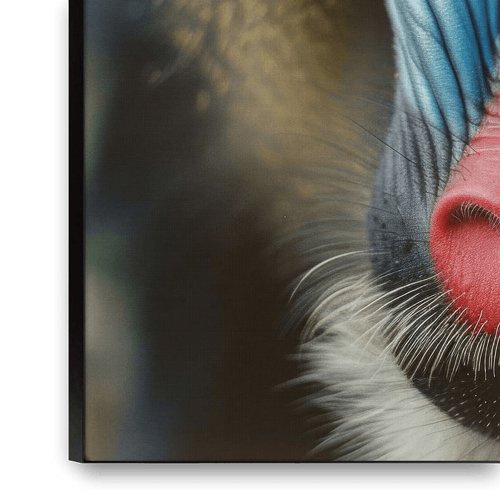 Das Bild zeigt ein beeindruckendes Porträt eines Mandrills, dessen markante Gesichtszüge im Fokus stehen. Besonders auffällig sind die leuchtenden Farben seines Gesichts: das kräftige Blau und Rot der Schnauze sowie die intensiven, bernsteinfarbenen Augen, die dem Tier einen geheimnisvollen Ausdruck verleihen. Der feine Kontrast zur…