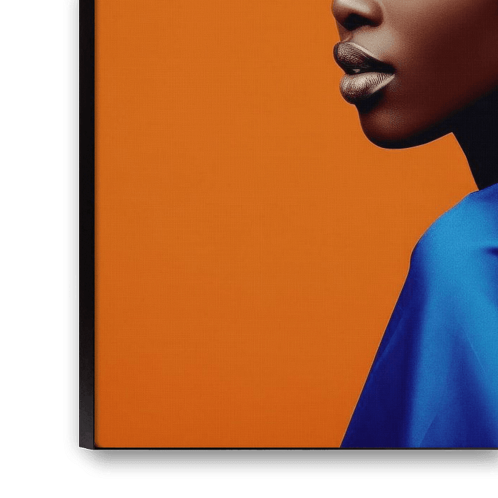 Farbenfrohes und ungewöhnliches Porträt einer afrikanischen Frau in ebenso farbenfroher Kleidung mit einem afrikanischen Motiv/Muster vor einem kontrastierenden orangefarbenen Hintergrund. Das macht das Werk zu einem echten Hingucker an der Wand!