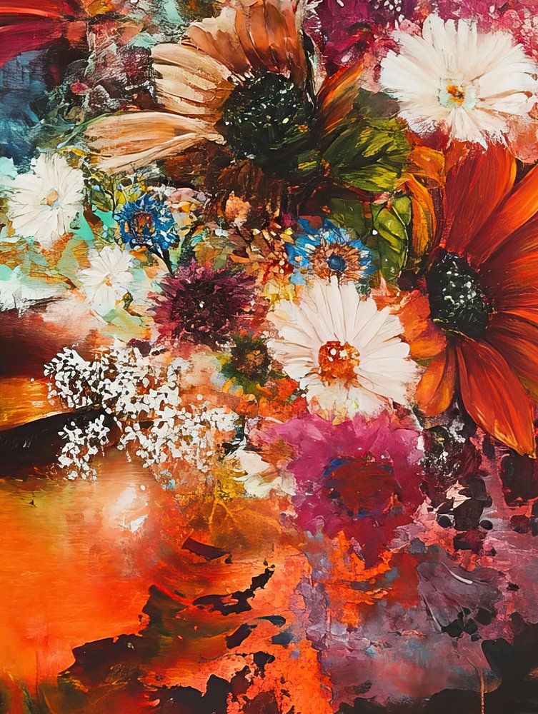 Farbenfrohes Porträt - Dieses weibliche Porträtgemälde verbindet die Seitenansicht eines Frauengesichts mit einer Explosion heller, leuchtender Blumen und abstrakter Formen, wodurch eine dynamische und farbenfrohe Komposition entsteht.