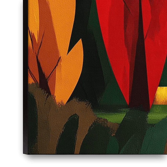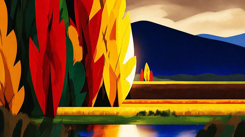 Herbstbäume, die leuchtend gelbes, rotes und orangefarbenes Laub zur Schau stellen und über einem ruhigen Gewässer aufragen. Die hellen Farben spiegeln sich im Wasser wider, während im Hintergrund eine dunkle Bergkette und ein bedeckter Himmel zu sehen sind. Das Ganze ist in einem modernen Kunststil gehalten.