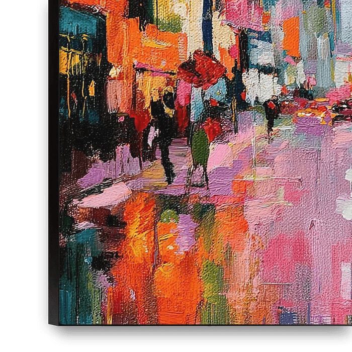 Dieses lebendige, impressionistische Gemälde fängt die pulsierende Energie einer geschäftigen Stadtstraße ein. Dominante, diagonal verlaufende Hochhausfassaden in leuchtenden Tönen von Pink, Orange, Gelb und Teal prägen das Bild. Die dicken, haptischen Pinselstriche verleihen den Gebäuden und den glühenden Fenstern eine greifbare…