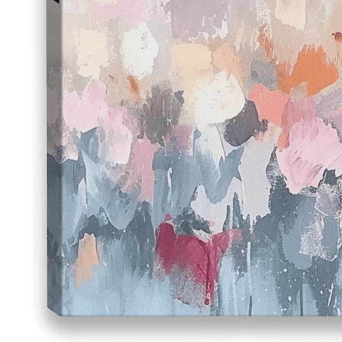 Color Rush - Dieses abstrakte Gemälde zeigt eine dynamische Verschmelzung von Farben und Textur, die den Eindruck eines Blumenfeldes vermittelt. Im Vordergrund sehen wir eine Ansammlung von Pinselstrichen in warmen Farben wie Rosa, Orange, Gelb und einigen leuchtenden Rottönen, die an Wildblumen in voller Blüte erinnern. Diese…