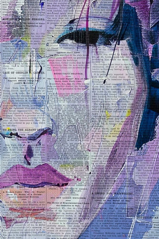 Ein zeitgenössisches Meisterwerk, in sanften Lila- und Grautönen gehalten, fängt die melancholische Ausstrahlung eines Gesichts ein. Die Verschmelzung von Aquarell und Zeitungsfragmenten schafft eine faszinierende Textur, während die träumerischen Augen und die sanften Konturen eine geheimnisvolle Anziehungskraft ausüben. Ein Spiel aus Licht und Schatten, das Emotionen weckt.