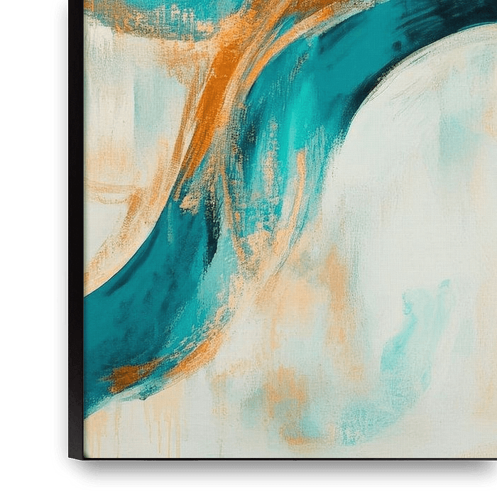 Sanfte Wellen aus Türkis und Gold schlängeln sich harmonisch durch einen warmen Hintergrund, der Ruhe und Eleganz ausstrahlt. Diese lebendige Komposition bringt einen Hauch von Kreativität und Lebensfreude in jeden Raum und eignet sich perfekt für das Wohnzimmer, wo sie Gespräche anregen und die Atmosphäre auflockern kann.