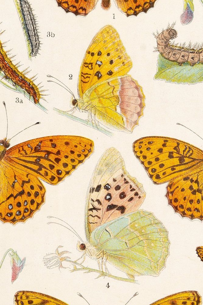 Ein Dutzend Schmetterlinge und ihre Raupen in wunderschönen Orangetönen mit Perlmuttflecken und rosa Perlmuttstreifen.