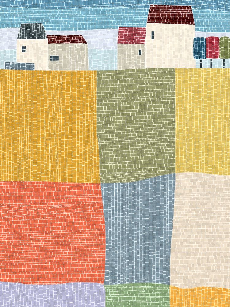 Bestelle diese Illustration Farm village mosaic background von Richard Laschon als Reproduktion auf Leinwand, Alu-Dibond, als Poster, Fototapete oder Acrylglasbild.