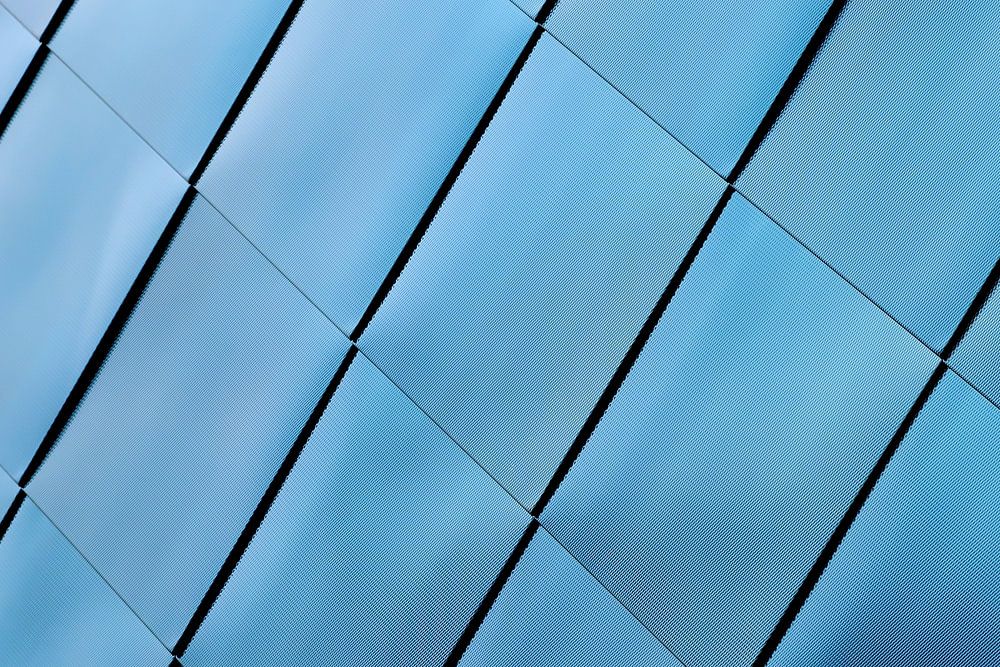 Dauerhafte feste Verkleidung einer Fassade eines Industriegebäudes in Magdeburg mit Platten aus dem speziellen blauen Edelstahl Rimex ColourTex zum Schutz des Gebäudes vor Witterungseinflüssen wie Wind und Wetter, von außen.