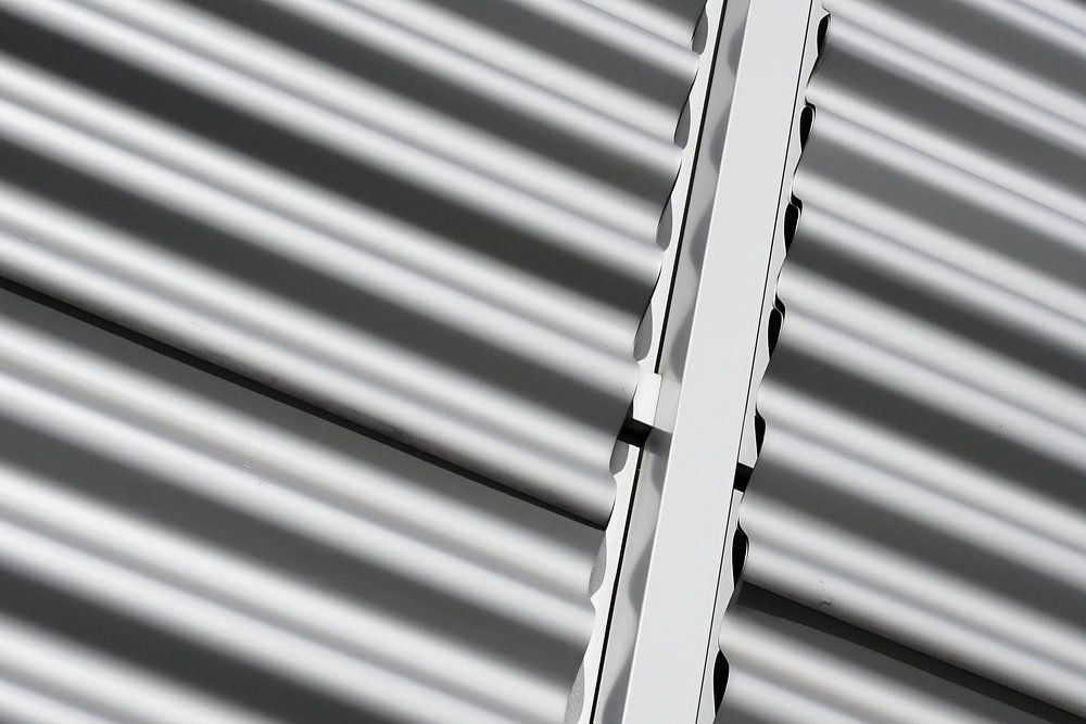 Dauerhafte Verkleidung der Fassade eines Bürogebäudes aus nicht rostendem rostfreien Wellblech aus Metall zum Schutz vor Witterungseinflüssen