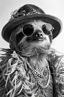 Ein schwarz-weißes Porträt eines Faultiers, bekleidet mit Hut und Sonnenbrille, das lässige Eleganz ausstrahlt. Ein perfektes Bild, das Stil und Tierliebe kombiniert.