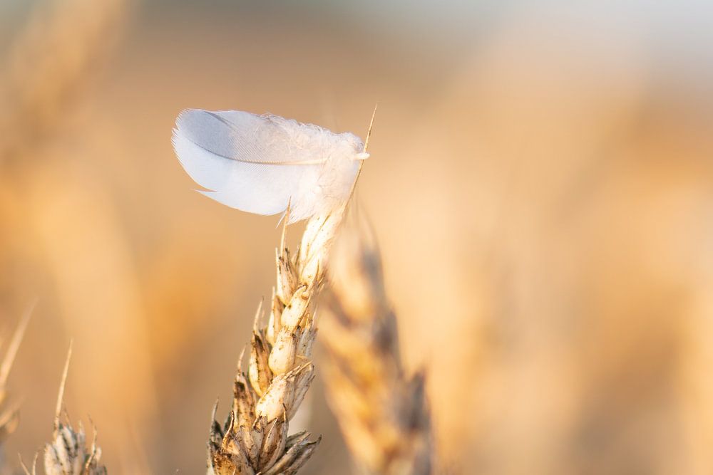 Nahaufnahme einer weißen Feder, die an einer Kornähre im goldenen Licht des Sonnenaufgangs befestigt ist.