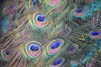 Das bunte Gefieder eines Pfaus aus der Nähe betrachtet.