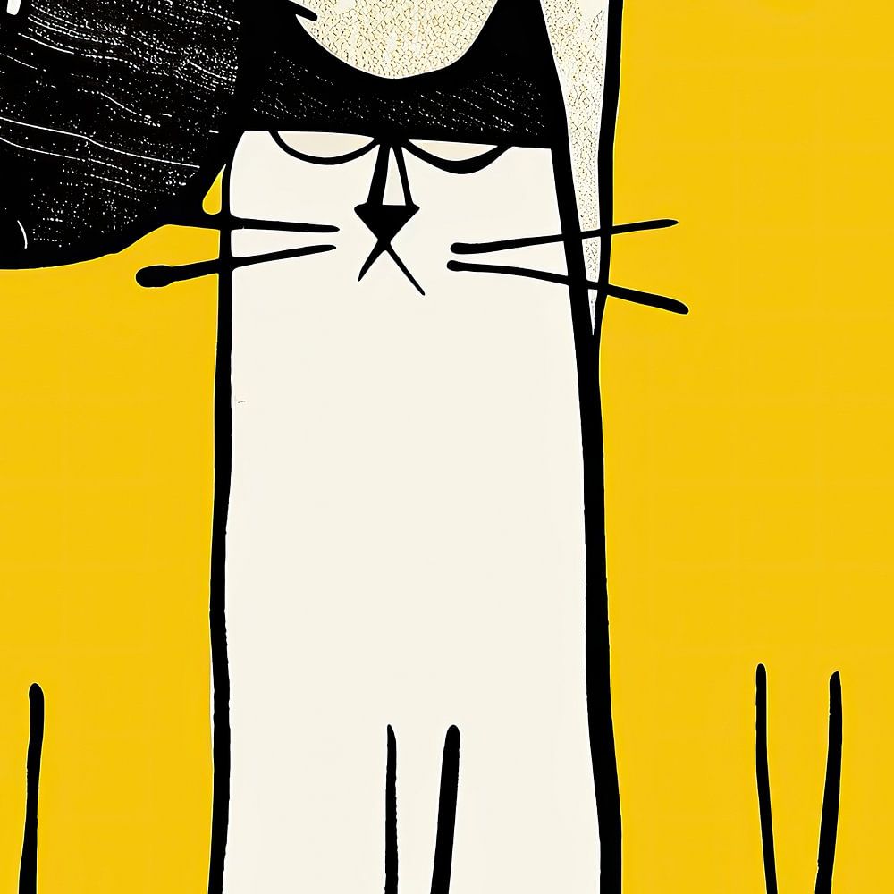 Feline Trio - Dieses Katzenbild zeigt drei vereinfachte, stilisierte Katzen mit ausdrucksstarken Augen und markanten Schnurrhaaren, die vor einem gelb-weißen Hintergrund stehen.