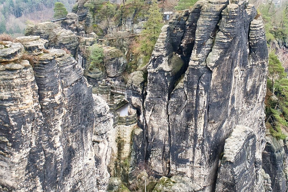 Felsen im Elbsandsteingebirge an der Bastei. Zerklüftetes Gestein umgeben von Bäumen.