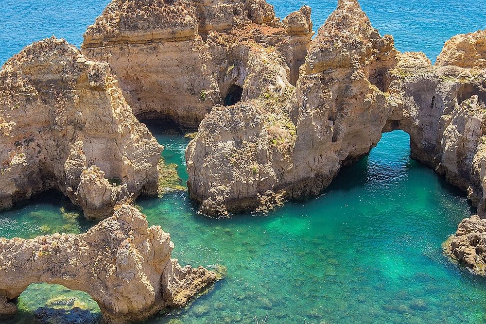 Felsen im blauen Meer auf der Küste in der Algarve Portugal. Während meines Urlaubs in diesem schönen Teil Europas habe ich dieses Bild der Landschaft gemacht. An diesem sonnigen Tag im Sommer können Touristen die Natur am Meer genießen. Der Horizont ist in der Ferne sichtbar.
