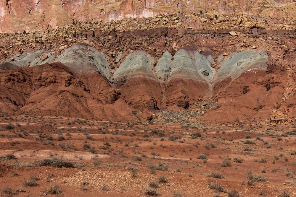 Diese enormen Felsformationen sind beeindruckend, die Schichtung in den Steinen ist besonders. Die orange Farbe des Felsens hebt sich von dem klaren blauen Himmel ab.