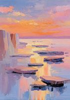 Dieses lebendige, impressionistische Gemälde fängt eine friedliche Küstenszenerie während eines Sonnenuntergangs ein. Der Himmel ist in kräftigen Strichen aus Orange, Gelb und Rosa gestaltet, die am Horizont in zarte Pastelltöne übergehen. Im ruhigen Wasser, das in Blau- und hellen Gelbtönen schimmert, liegen mehrere flache,…