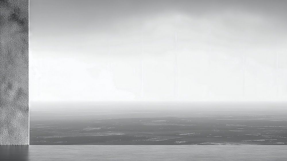 Die rechte Seite öffnet sich zu einer weiten, nebelverhangenen Landschaft oder einem Meerblick, der in sanften Graustufen gehalten ist. Die starke horizontale Trennlinie des Horizonts teilt die glatte Fläche des Vordergrundwassers von einem helleren, diffusen Bereich im Hintergrund und dem dramatisch bewölkten Himmel darüber. Dieser äußere Bereich wirkt fast abstrakt in seiner Trostlosigkeit und Stille.
