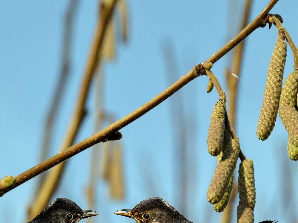 Fensterblick, Amselgespräche im Frühling, Frühling, Durchblick, Haselstrauch, Flora, Floristik, gelb, blau, Fensterbild, Frühling, Jahreszeiten,Frühlingserwachen, Fensterbilder, Blumenfenster, Himmel, Strauch, Jahreszeiten, Amsel, Singvögel, Motivation, Kinderzimmer,