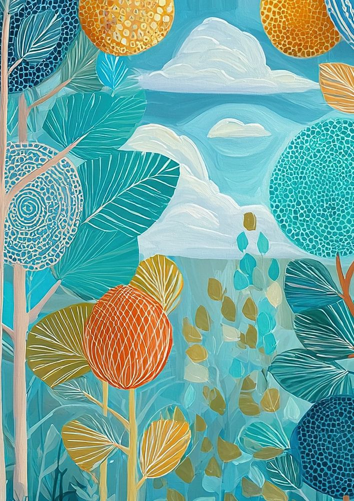 Lebendiges Naturfest - Dieses farbenfrohe Landschaftsgemälde zeigt eine lebendige Mischung aus abstrakten Bäumen mit auffälligen, kreisförmigen Blättern in verschiedenen Blau-, Grün- und Orangetönen vor einem klaren, wolkenverhangenen Himmel und einem blühenden Hintergrund voller fröhlicher Blumen, was dem Bild einen modernen und frischen Look verleiht.