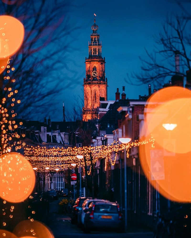 Festliche Lichter in der Nieuwe Blekerstraat + ein beleuchteter Martini-Turm in der Stadt Groningen während der festlichen Monate.