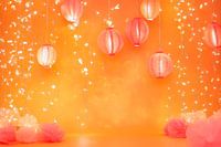 Ein strahlendes orangfarbenes Ambiente umhüllt von zarten rosa Laternen und funkelnden Lichtern schafft eine festliche Stimmung. Sanfte Pompons aus Seide fügen einen verspielten Touch hinzu. Ideal für ein gemütliches Wohnzimmer oder eine einladende Feierfläche, bringt dieses Bild Freude und Lebenslust in jeden Raum.