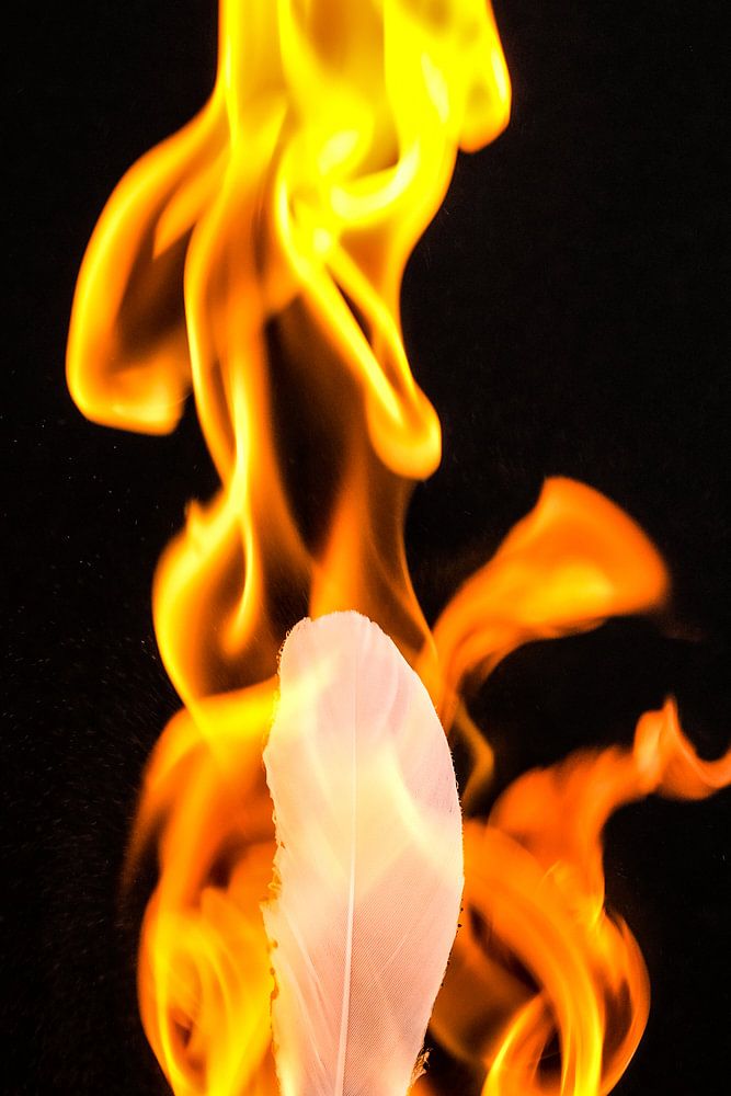 Weiße, brennende Feder vor schwarzem Hintergrund